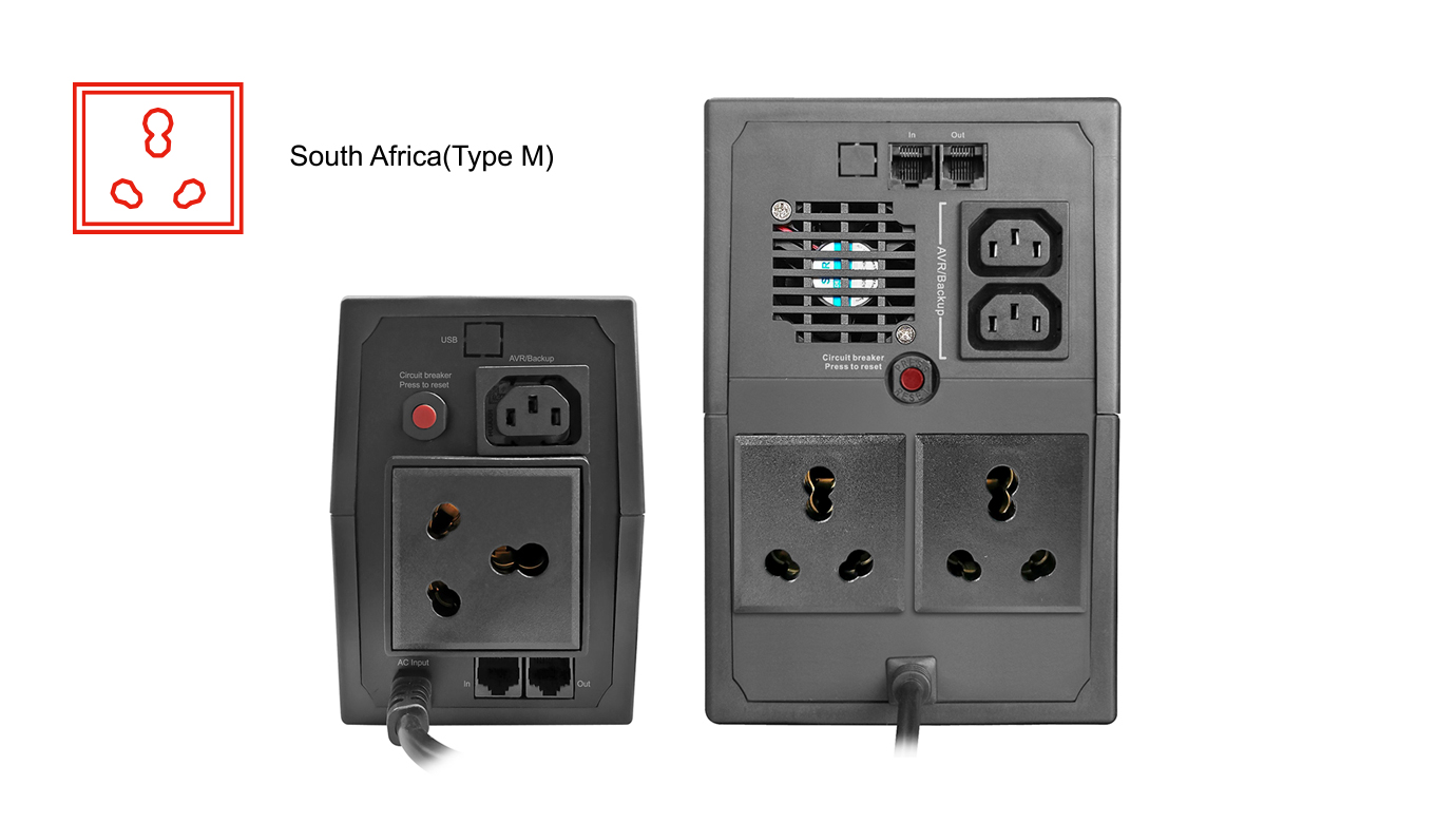 | Outlet: South Africa (Type M) | South Africa(Type M) *1pc + IEC-320 C13 *1pc Backup/AVR/Surge protected | South Africa(Type M) *2pcs + IEC-320 C13 *2pcs Backup/AVR/Surge protected | ||||||