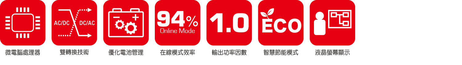 | 選配功能 | SNMP網管卡、AS400通訊卡、並聯套件、LBS(負載匯流排同步技術)、冷啟動 | ||||
